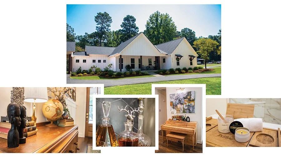 Several pieces of commissioned artworks from Kathy Couch, as well as some exceptional antique pieces from Olive Street Vintiques, create the atmosphere of sophistication and warmth prevalent throughout the space. Carefully selected furniture pieces and a color palette of deep greens, golds, and earthy tan hues also contribute an air of cozy charm. With abundant personality and expert craftsmanship, this new home sets the stage for Trey and Jennifer’s future, one in which they always have a special place to call their own.