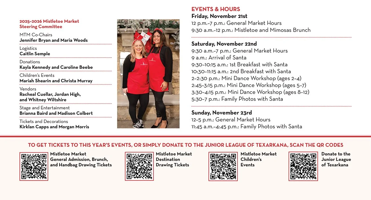 Don’t miss out on this festive opportunity to shop, celebrate, and create lasting memories with family and friends at the 2025 Mistletoe Market. General admission tickets are $10. Purchase event tickets at jltexarkana.org or by scanning the QR code below.