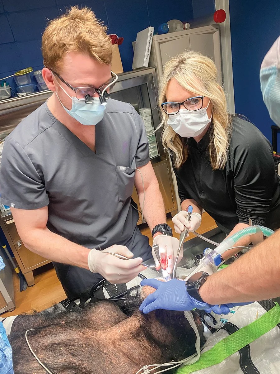 Dr. Zachary Legan and Angie Satterfield perform oral surgery on a patient at the Little Rock Zoo. submitted photo.