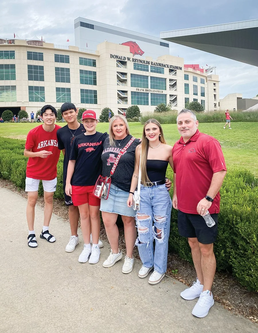 The Sherman family took Jirapat and Haruto to an Arkansas Razorbacks football game. submitted photo