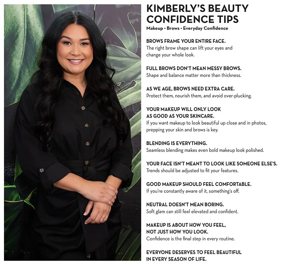 In college, Kimberly initially chose the pre-med route, following what felt practical and expected. Then one day, everything shifted. “I just woke up and was like, ‘I don’t want to do this,’” she said. Trusting that instinct, she enrolled in cosmetology school. At first, she imagined herself as a hairstylist, but she quickly found herself drawn elsewhere. “I found myself more in the esthetician room,” she explained, “doing facials and makeup and eyebrows.” It was there—working with skin, shape, and detail—that her artistic background and natural intuition came together.