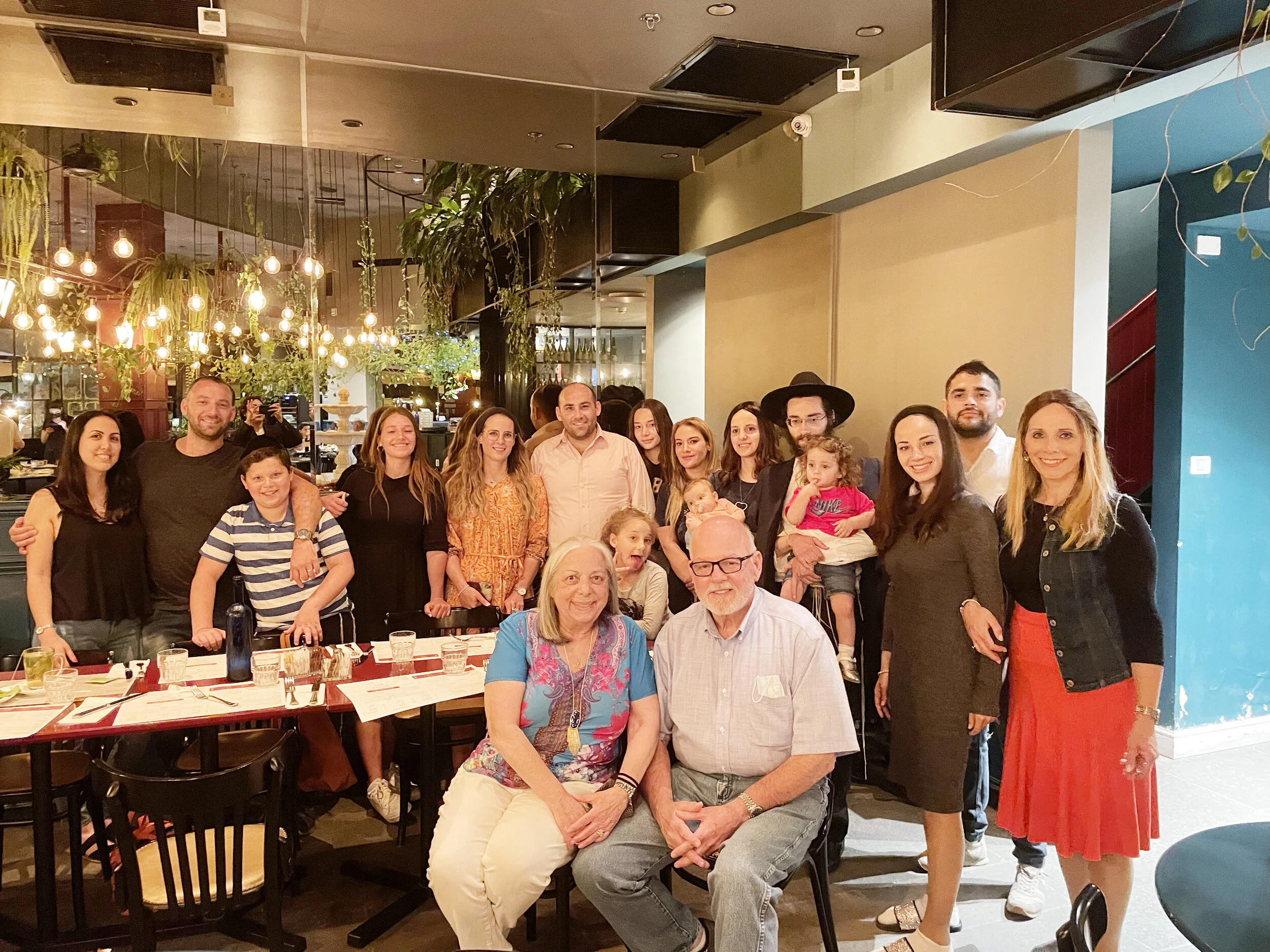 Mike, Betty, and their crew enjoying a family outing at a restaurant in Israel. Mike admits, “No rockets are going to keep us from having fun!”