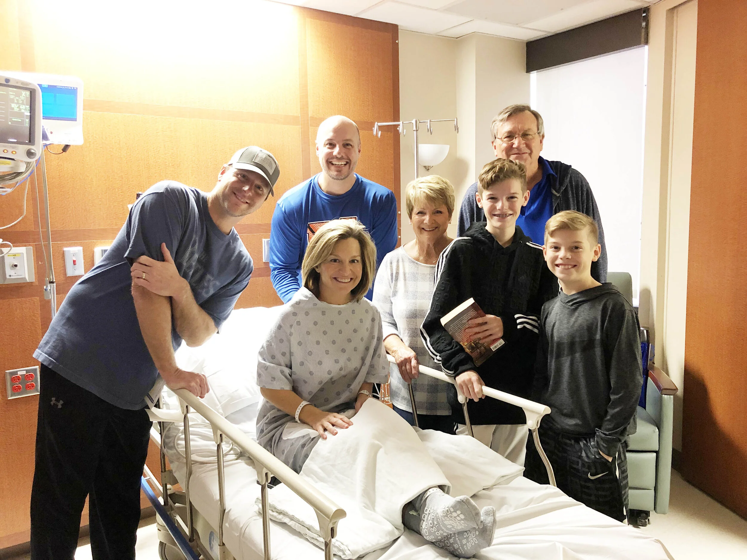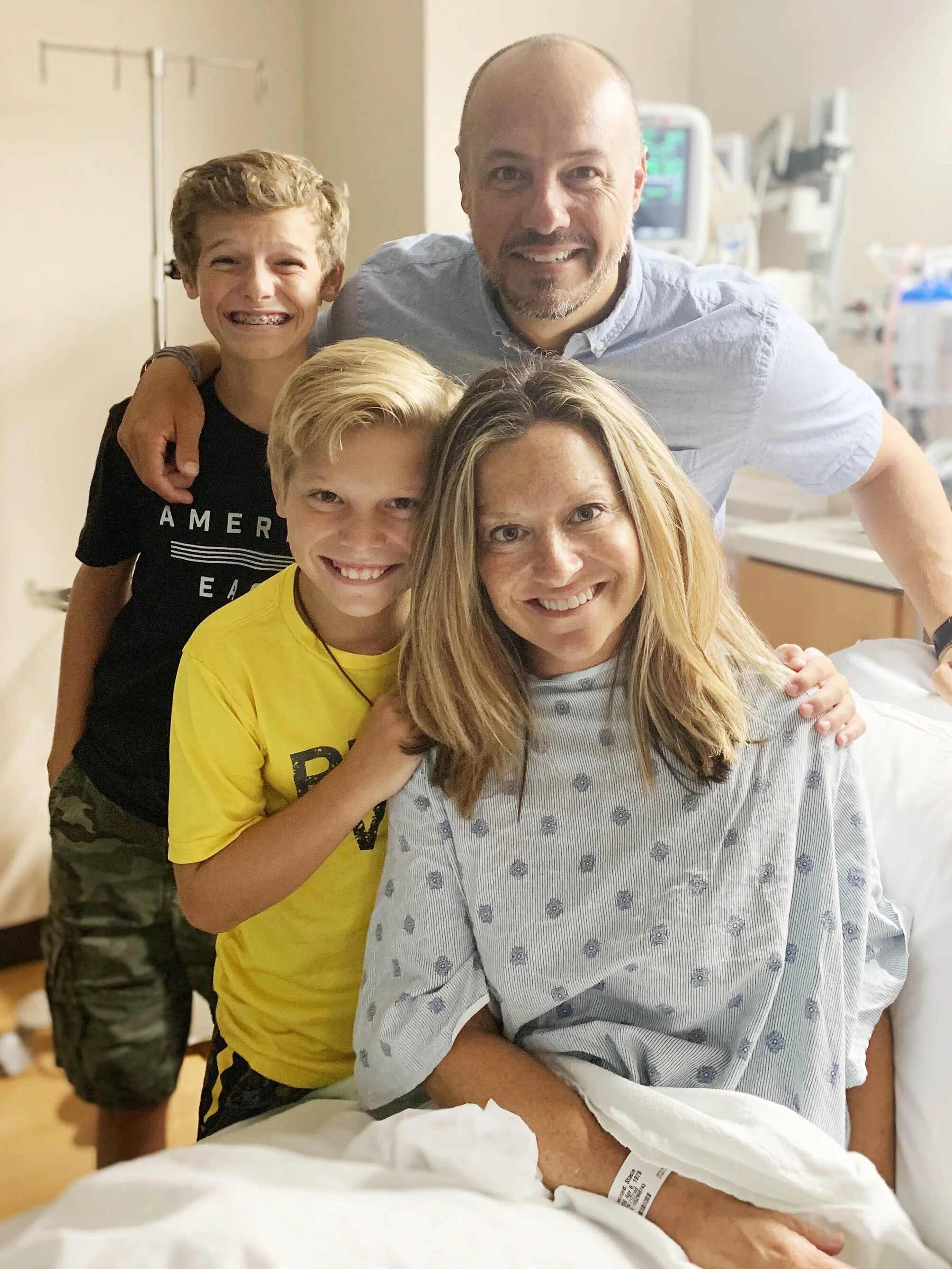 Right before surgery at MD Anderson in November 2018, Stacie poses for a photo with her brother, Brad Buchanan; mother, Patti Buchanan; father, James Buchanan; husband, Brandon; and sons, Dakota and Denver.