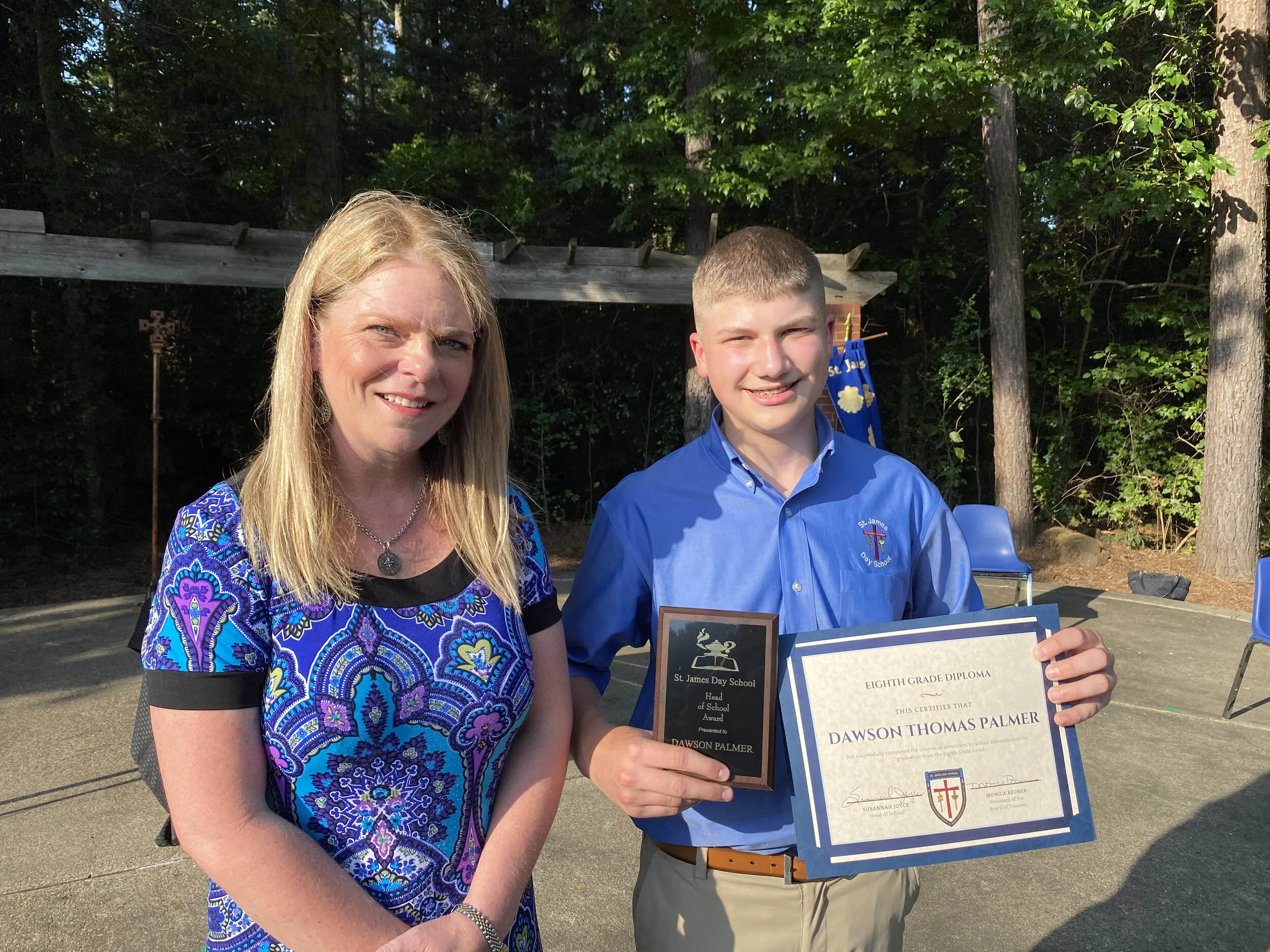 During St. James’ 8th grade graduation this year, Susannah presented the Head of School award for 2020 to Dawson Palmer, which includes a college scholarship in the amount of $1,000 to the school of the recipient’s choice upon graduation from high school. Funds for this scholarship are made possible by an endowment set up by Buddy Bell in honor of his mother, Martha Bell, a former teacher at St. James.