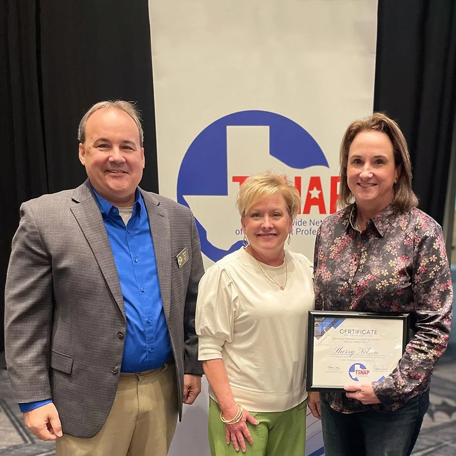 Texas Statewide Network of Assessment Professionals (TSNAP) selected TISD District Testing Coordinator Sherry Nelson as TSNAP DTC of the Year. Nelson represented TISD and Region 8, who nominated her for this honor.